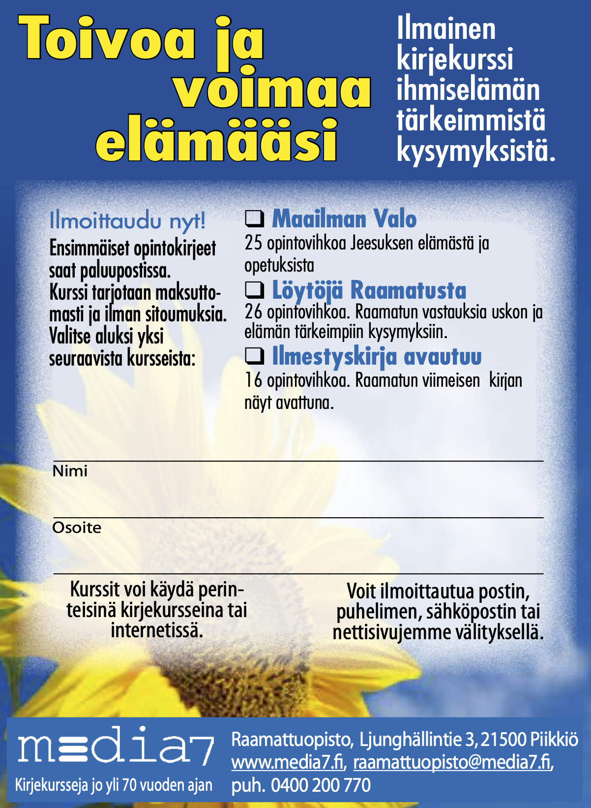 "Mutta hänen lupauksensa mukaan me odotamme uusia taivaita ja uutta maata, joissa vanhurskaus asuu." 2.Piet. 3:13